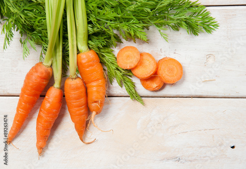 Fresh washed carrots on white wooden table
