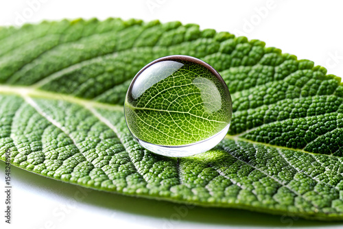 Fresh Water Drop Resting on Green Leaf Isolated on White Background with Clipping Path, Generative AI