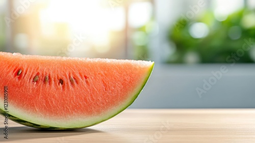 Fresh watermelon slice glistens under soft light on wooden table