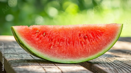 Fresh Watermelon Slice on Wooden Table with Green Background