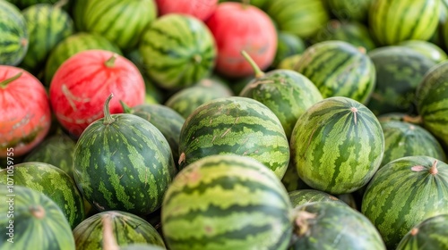Fresh watermelons stacked in a vibrant outdoor market during a sunny afternoon in late summer
