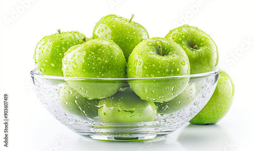 Fresh Wet Green Apples in a Glass Bowl on White Background