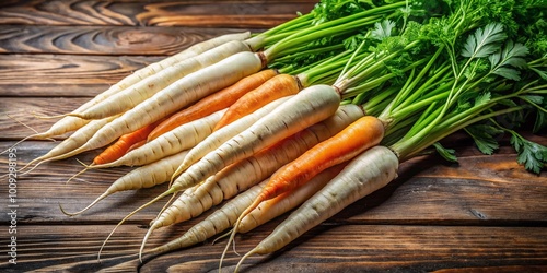 Fresh White Carrots on Rustic Wooden Table Ready for Cooking and Healthy Meal Preparation