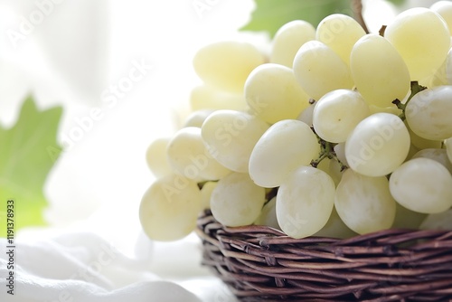 Fresh White Grapes in a Rustic Basket with Natural Lighting and Green Leaves : Generative AI