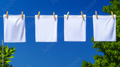 Fresh white laundry hanging on line against clear blue sky, surrounded by green foliage, evokes sense of cleanliness and tranquility