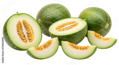 Fresh whole and sliced green cantaloupe melons with seeds isolated on white background, healthy fruit perfect for summer snacks and recipes