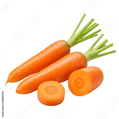 Fresh whole carrots with green tops and one halved carrot showing vibrant orange flesh, isolated on white or transparent background