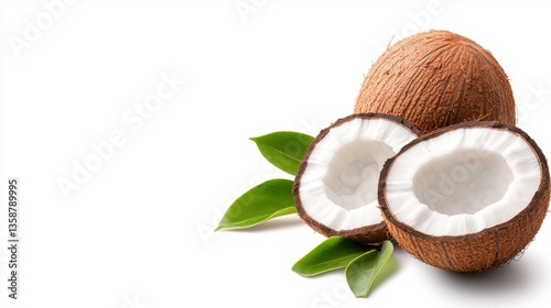 Fresh Whole Coconut Halved Showing White Flesh Tropical Fruit with Green Leaves