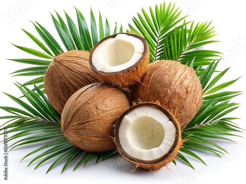 Fresh Whole Coconuts with Lush Green Palm Fronds on White Background Tropical Fruit Healthy Snack Delicious Delightful Summertime Treat