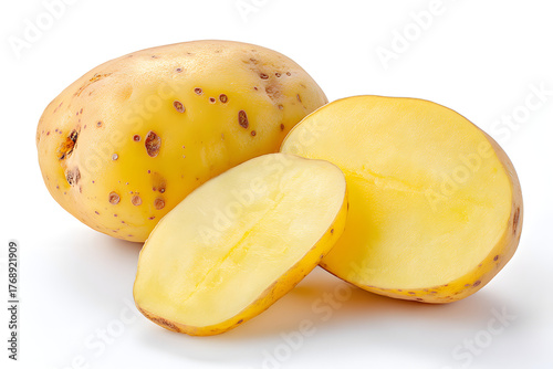 Fresh Whole Yellow Potato with a Slice Revealing Creamy Interior for Culinary Use and Recipe Inspiration