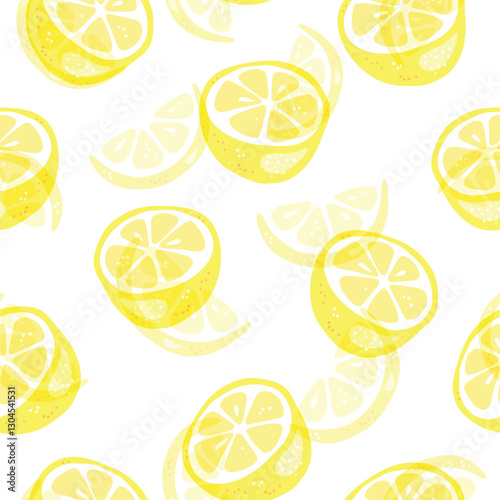Fresh yellow fruits of lemon, lime, with green leaves and flowers. Seamless citrus texture on a white background. Whole lemon slice. Doodle Minimal Style. Black line. Vector illustration.