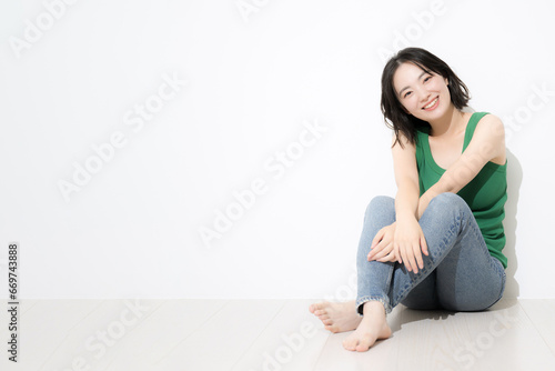Fresh young bright sunny woman Spring/Summer image Copy space on left