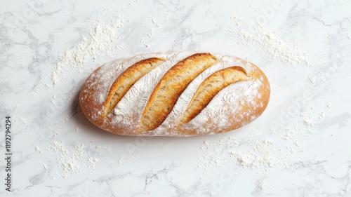 Freshly Baked Artisan Bread Loaf on Marble Surface with Flour Dust