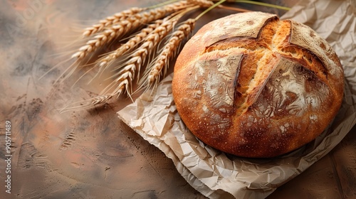 Freshly Baked Artisan Bread With Wheat Stalks on a Rustic Table in Natural Light