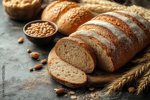 Freshly baked artisanal bread on a rustic wooden board with nuts and grains nearby