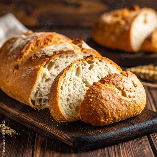 Freshly baked artisanal sourdough bread sliced on a rustic wooden cutting board, ready for a wholesome meal