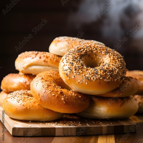 Freshly baked bagels, adorned with sesame and poppy seeds, ready to be toasted and paired with cream cheese for a wholesome breakfast or brunch.
