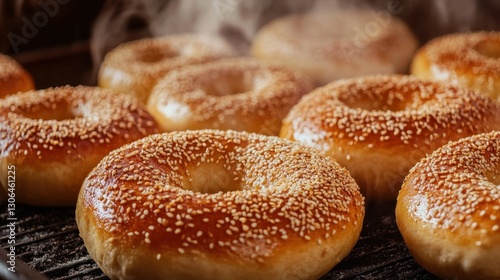 Freshly Baked Bagels with Sesame Seeds on a Griddle, Hot Steaming Delicious Breakfast Pastry Food Ready to Serve for Breakfast or Snack Time