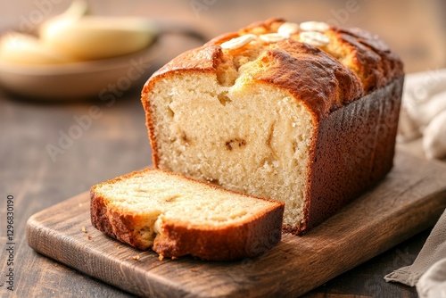 Freshly Baked Banana Bread Loaf with Slices on Wooden Board