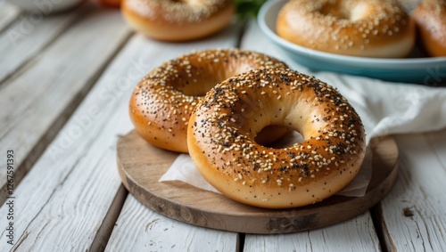 Freshly baked baranka bagels with sesame seeds served on a rustic wooden platter against a bright, light wooden table background.
