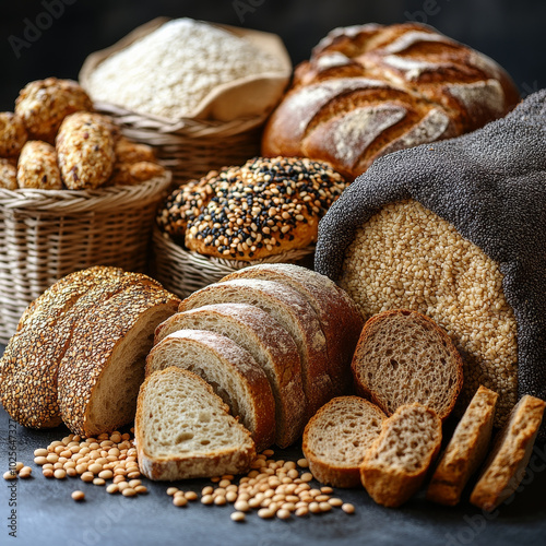 Freshly baked bread assortment featuring various types of loaves, including sesame and whole grain, alongside grains and seeds, creating wholesome and inviting scene