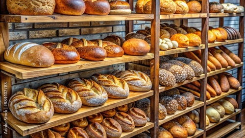 Freshly baked bread loaves arranged artfully on a wooden rack, enticing customers with warm aromas and inviting textures.