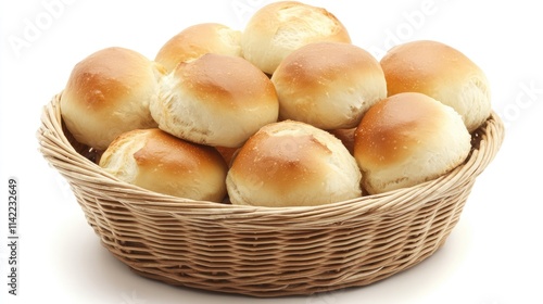 Freshly baked bread rolls in a rustic wicker basket on a white background showcasing warmth and inviting home-cooked charm