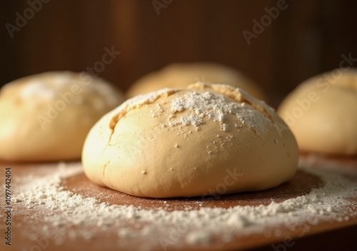 Freshly baked bread rolls resting on a wooden board with flour dust