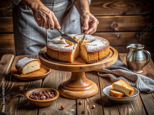 Freshly baked cake on a rustic wooden plate, surrounded by utensils and a napkin, with a slice being carefully lifted out by eager hands.