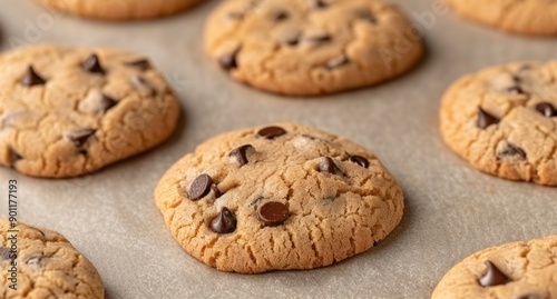 Freshly baked chocolate chip cookies on a baking sheet