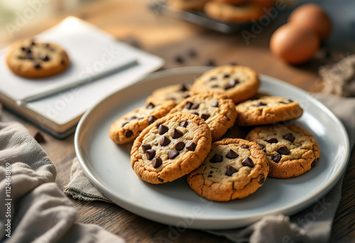 Freshly baked chocolate chip cookies on a plate, with a notebook and eggs in the background
