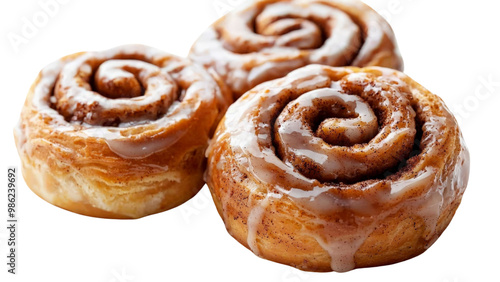 Freshly baked cinnamon rolls isolated on transparent background, PNG file, glazed and sweet