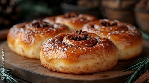 Freshly baked cinnamon rolls steaming on a wooden board