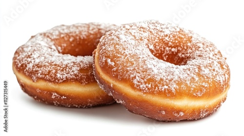 freshly baked classic donuts dusted with powdered sugar on a white background for an appetizing dessert or snack advertisement