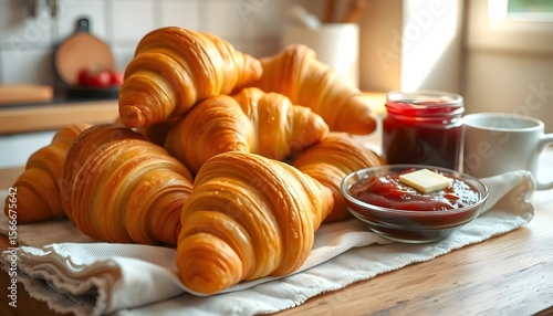 Freshly baked croissant and a warm cup of coffee make for a delicious breakfast pastry meal to start the morning