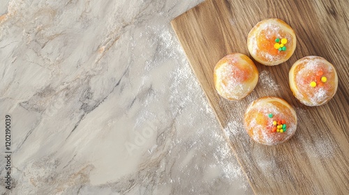 Freshly baked donuts topped with colorful sprinkles on a wooden board with flour dust, Copy Space