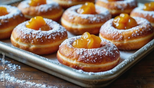 Freshly baked doughnuts topped with apricot jam on a rustic wooden table