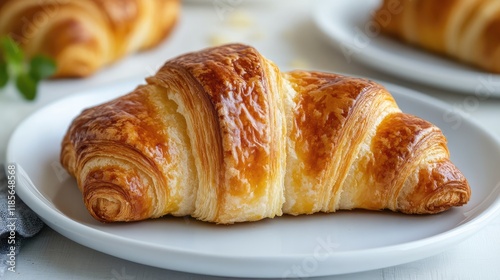 Freshly baked French butter croissant on a white porcelain plate ideal for breakfast or brunch food styling and culinary photography
