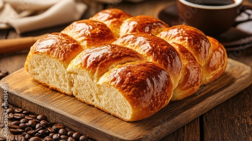 Freshly Baked Golden Bread Loaf on Wooden Board with Coffee and Coffee Beans in the Background