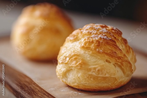 Freshly Baked Golden Croissants on a Rustic Wood Board, Showcasing Flaky Layers and Tantalizing Texture, Perfect for Breakfast or Bakery Displays