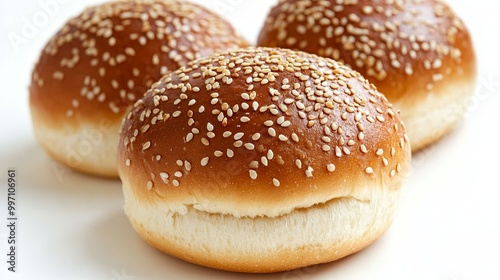 Freshly baked hamburger bun on a white background, sprinkled with sesame seeds.