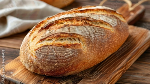 freshly baked homemade artisan sourdough bread loaf on round wood plank