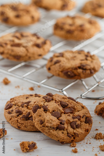 Freshly baked homemade round chocolate cookies with chocolate chips. Delicious pastries. dessert. Selective focus