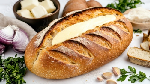 Freshly Baked Loaf of Bread with Creamy Butter and Parsley Garnish