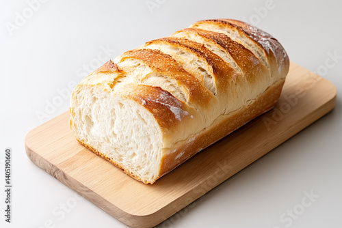 Freshly baked loaf of white bread on wooden cutting board with soft lighting
