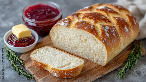 Freshly baked loaf sliced on a wooden board, with jam and butter