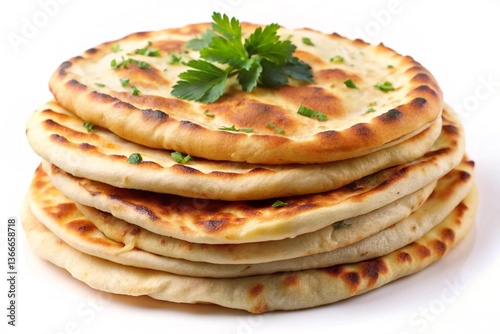 Freshly baked naan flatbreads stacked with a touch of green herbs, perfect for showcasing in culinary photography