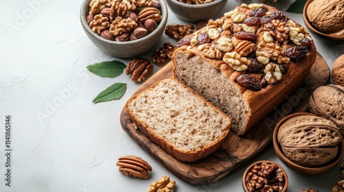 Freshly Baked Nut Bread with a Variety of Nuts Topped, Surrounded by Nuts and Natural Elements on a Wooden Cutting Board and Bowls
