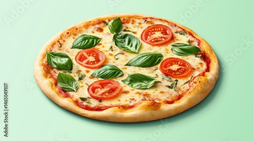 Freshly baked pizza with basil, tomatoes, and mozzarella cheese