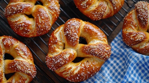 Freshly baked pretzels with coarse salt resting on a cooling rack.
